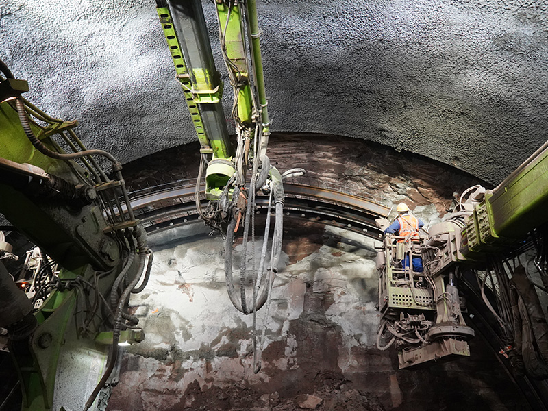LH-150Y掘進支護一體機組是藍海智能針對隧道掌子面施工開發(fā)集掘進開挖、支護、噴漿、打錨桿作業(yè)等功能于一體的集成化施工,實現(xiàn)掌子面全工序作業(yè)設備。具備非爆掘進、鉆爆掘進、出渣、立架、打鎖腳和錨桿、注漿、噴漿等進行平行作業(yè)能力,能滿足鐵路單洞雙線隧道、高速隧道、市政隧道、鐵路小斷面隧道施工作業(yè),一次掘進隧道斷面尺寸寬度14-16米,掘進高度7.8米以上,相比現(xiàn)在采用單工序循環(huán)作業(yè)方式,每班提升效率50%~60%。